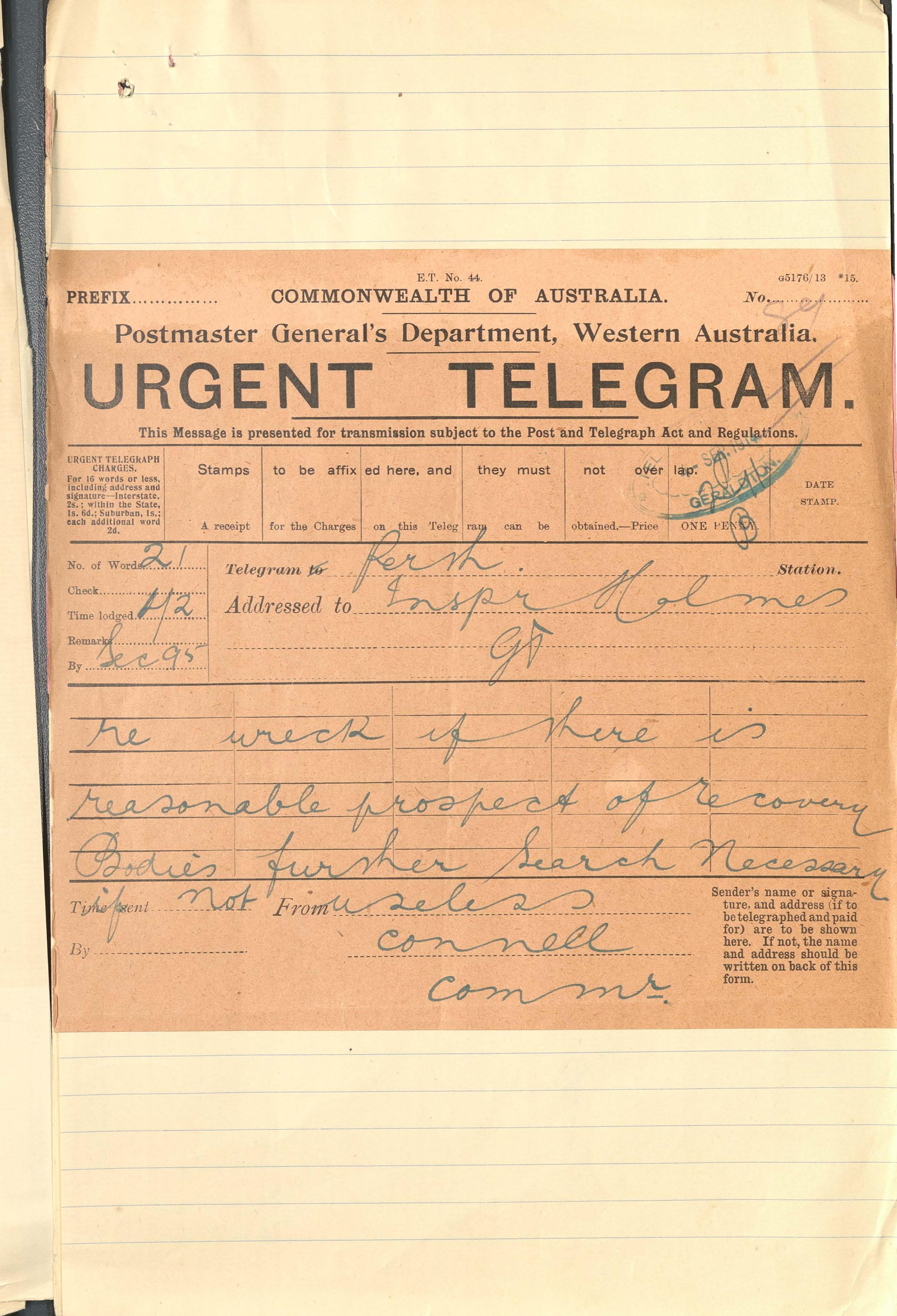 A wire received by the Commissioner of Police (Mr. R. Connell) from Inspector Holmes of Geraldton, stated that due to unfavourable weather, the vessel, which intended to take the Police to Gun Island in search of bodies, was unable to make the Island, and he considered it useless to make this trip to a place “infested with shark and crayfish”.