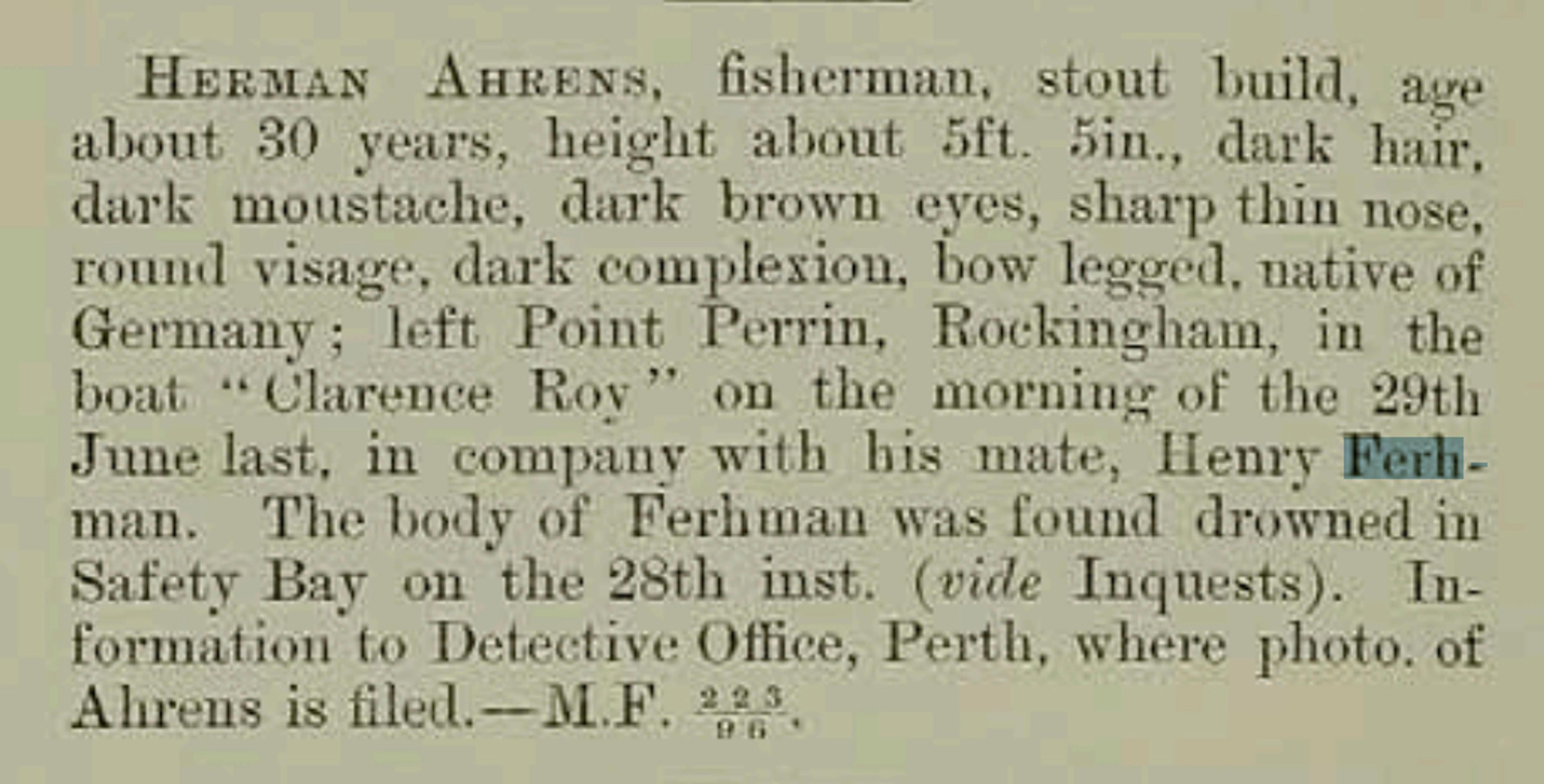 The Police put out a missing persons notice in their monthly gazette for Ahrens. He was described as a fisherman, of stout build, and of around 30 years of age. He was about five foot five inches tall, with dark hair, dark moustache, dark brown eyes and sharp thin nose. He had a round visage, dark complexion, bow legged and was a native of Germany.