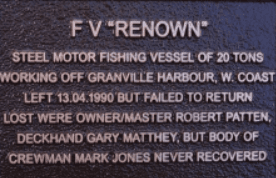The memorial plaque for the fishing boat Renown is located in a public park overlooking Spring Bay, on the west coast of Tasmania. Renown was working out of Granville Harbour, Strahan on 13 April 1990. She failed to return.